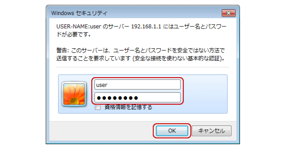 ログインするためのBasic認証画面(Windows セキュリティ)が表示されます。ログイン情報、「ユーザ名」と「パスワード」を入力します。ユーザ名には「user」パスワードは自分で設定したパスワードを入力し[OK]をクリックします。「資格情報を記憶する」にチェックを付けておくと次回からログイン画面を自動的に進めることができます。