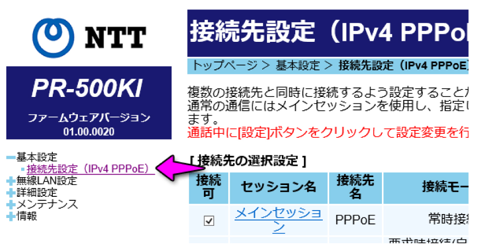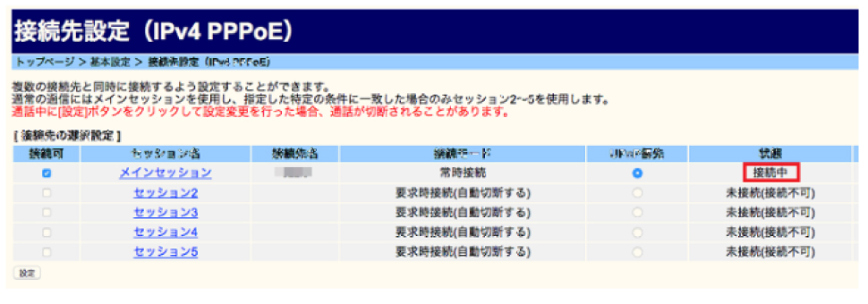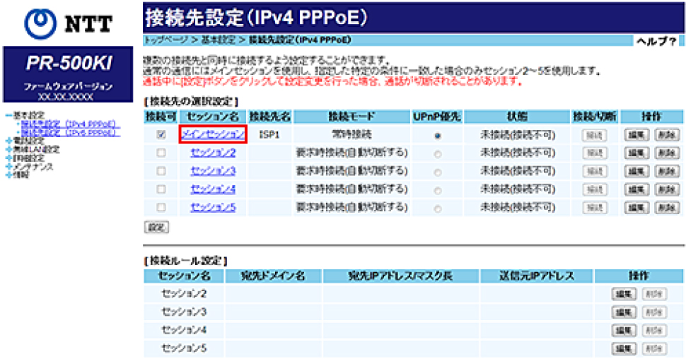 「接続先設定(IPv4 PPPoE)」(または「接続先設定」)の画面で、「メインセッション」を選択します。