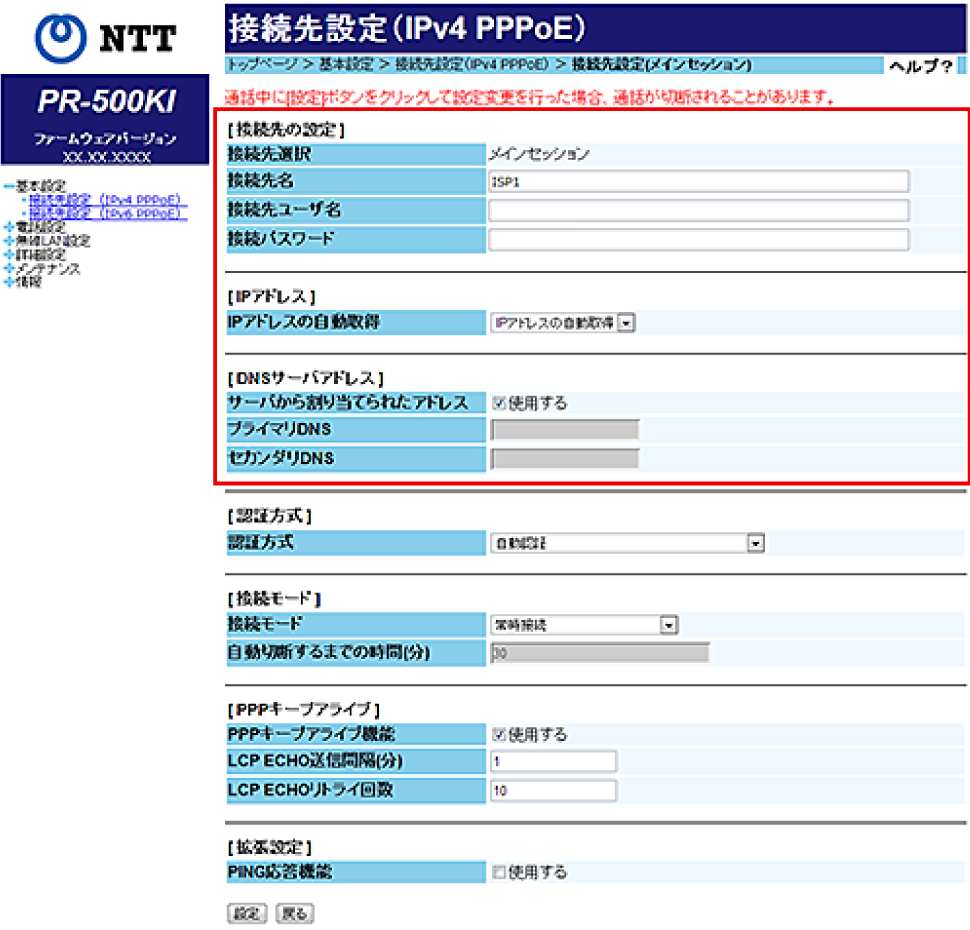 左メニューから「基本設定」>「接続先設定(IPv4 PPPoE)」を選択します。
